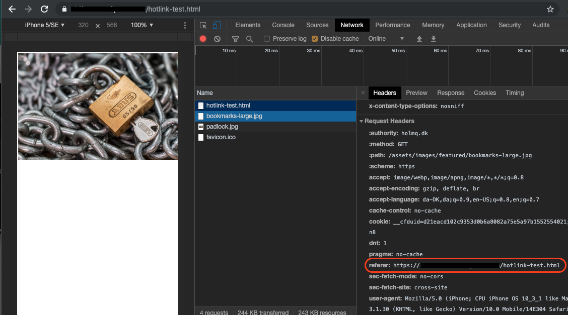 The referrer field in the request header isn’t YOURDOMAIN.com which is accepted in the nginx code, so this triggers the redirect to the padlock image