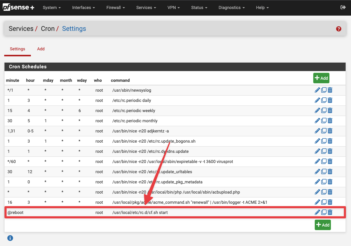 echo " #!/bin/sh # PROVIDE: cf # REQUIRE: cleanvar SERVERS # Options to configure cf(cloudflared) via /etc/rc.conf: # # cf_enable (bool) Enable service on boot # Default: NO # # cf_conf (str) Config file to use # Default: /usr/local/etc/cloudflared/config.yml # # cf_mode (str) Mode to run cloudflared as (e.g. 'tunnel', 'tunnel run' # or 'proxy-dns'). Should you use the default, a free # tunnel is set up for you. # Default: "tunnel" # # cf_origin_cert (str) path to origin certificate # Default: "/etc/cloudflared/cert.pem" # # cf_tunnel_id (str) Your Cloudflared Tunnel ID # . /etc/rc.subr name="cf" rcvar="${name}_enable" : ${cf_enable:="YES"} : ${cf_conf:="/root/.cloudflared/config.yml"} : ${cf_origin_cert:="/root/.cloudflared/cert.pem"} : ${cf_mode:="tunnel run"} : ${cf_tunnel_id="<YOUR TUNNEL ID>"} logfile="/var/log/cloudflared.log" pidfile="/var/run/cloudflared.pid" procname="/usr/local/bin/cloudflared" command="/usr/sbin/daemon" command_args="-o ${logfile} -p ${pidfile} -f ${procname} --origincert ${cf_origin_cert} --config ${cf_conf} ${cf_mode} ${cf_tunnel_id}" stop_postcmd="killall cloudflared" load_rc_config $name run_rc_command "$1" " > /usr/local/etc/rc.d/cf.sh chmod +x /usr/local/etc/rc.d/cf.shInstall the cron package in pfSense and configure it to start the script on boot