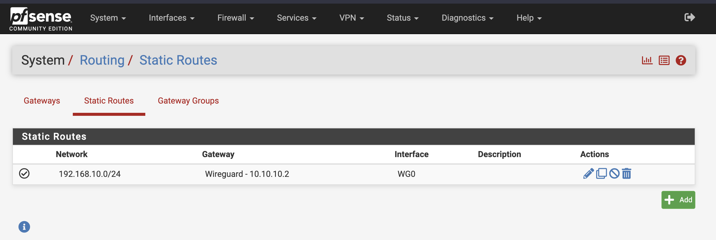 - On Router A, create a static route for network 192.168.10.0/24 destined to an interface on Router B (Wireguard 10.10.10.2/30 in my case).